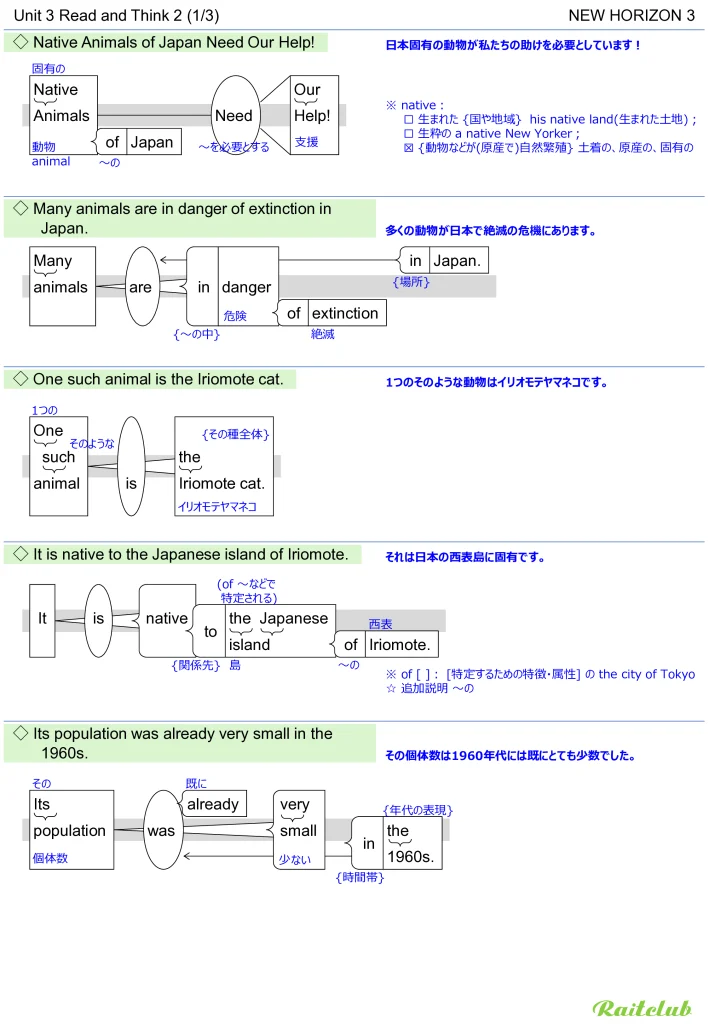 中学3年生教科書 New Horizon 3 (ニューホライズン 3年) 2025~28年度用 Unit 3: How can we save animals? の重要文法と、本文・和訳・英文見える化チャートです。